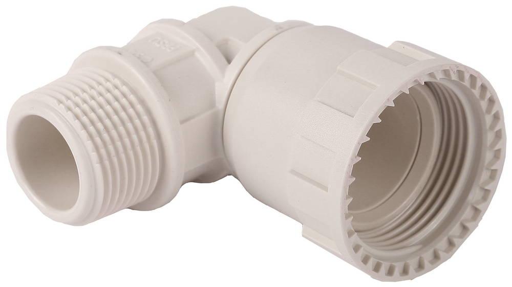 Для подсоединения металлопластиковой трубы к металлической трубы с внутренней резьбой, расположенных под углом 90˚ друг относительно друга, через накидную гайку и штуцер