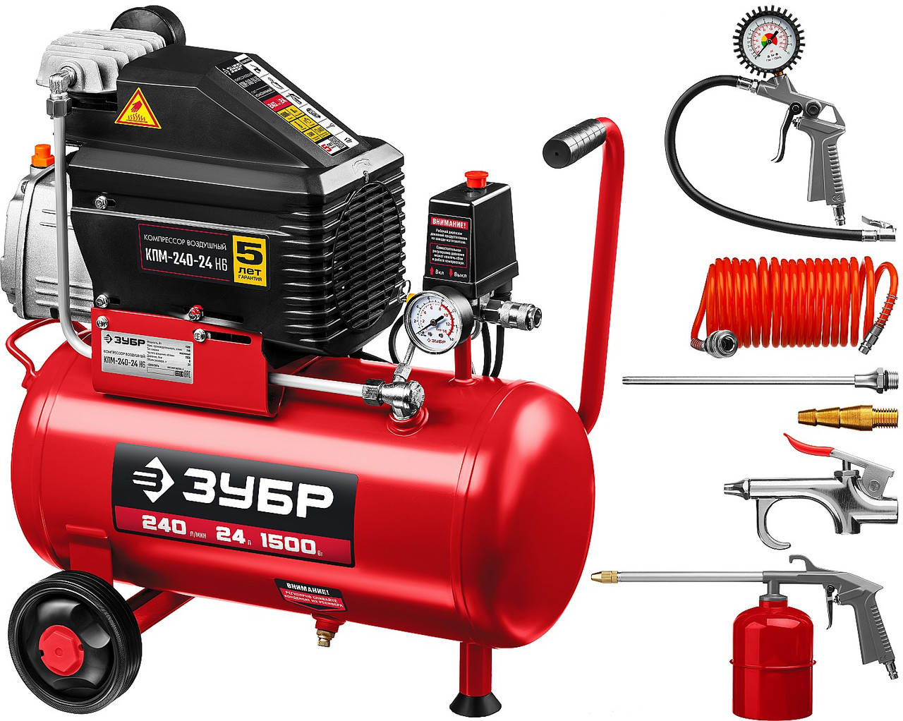 ЗУБР 240 л/мин, 24 л, 1500 Вт, 6 предметов, масляный компрессор (КПМ-240-24 Н6)