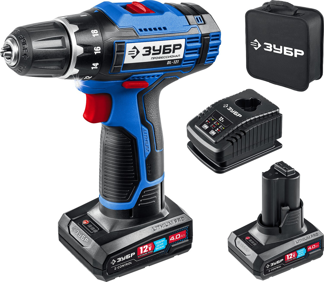 ЗУБР 12 В, 40 Н·м, 2 АКБ тип Т7 (4 А·ч), дрель-шуруповерт, сумка, Профессионал (DL-121-42)